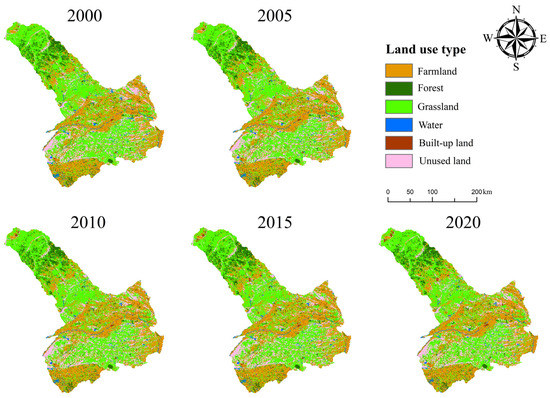 Figure 3 shows the spatial distribution of LULC in Tongliao from 2000 to 2020. The LULC area results for 2000, 2005, 2010, 2015, and 2020 showed that grassland was consistently the most extensive, followed by farmland and unused land (Table 2). Other, forest and built-up land and water were far less extensive. In general, the area of each type of land in Tongliao has not changed much in the 20 years from 2000 to 2020. Among them, the area of farmland and built-up land increased the most, increasing by 341.18 km2 and 220.56 km2, respectively. The area of unused land increased the least, by a total of 2.49 km2. On the contrary, the area of grassland decreased the most, reaching 380.08 km2. The area of water and forest decreased by 123.61 km2 and 60.54 km2, respectively. In addition, during these 20 years, the area of built-up land has continued to increase, while the area of the forest continued to decrease. Farmland increased continuously from 2000 to 2015 but decreased from 2015 to 2020. On the contrary, grassland and water decreased continuously from 2000 to 2015 but increased from 2015 to 2020. The changing trend of unused land during 20 years fluctuated.