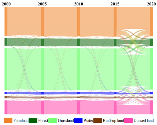 Figure 4 shows the area where the major LULC changes occurred between 2000 and 2020, and it also highlights the major pattern of changes over this period using a Sankey diagram. From 2000 to 2005, the main LULC changes came from grassland, farmland, and unused land. Mainly, 313.47 km2 of the grassland was transferred into arable land, while 212.87 km2 of the arable land was transferred into grassland. In addition, 244.90 km2 of the grassland was transferred to unused land, and 235.20 km2 of the unused land was converted to grassland. During the 10-year period from 2005 to 2015, the transition area between different LULCs was small. Differently, since 2015, there has been a larger transition between various types of LULC in Tongliao, which is more than in the past 15 years. Among them, the most important is the mutual transition between grassland and farmland. There was 2877.23 km2 of grassland transferred into farmland, and 2831.9 km2 of farmland transferred into grassland. In addition, a large amount of grassland was transferred to forest and unused land, with 1093.1 km2 and 1889.23 km2, respectively. There was also some farmland and grassland transferred into built-up land.
