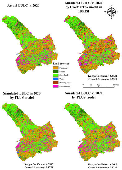 - The accuracy of the FLUS model (Kappa coefficient = 0.7613) and the PLUS model (Kappa coefficient = 0.7622) is similar, and both are higher than the CA-Markov model in IDRISI 17.0 (Kappa coefficient = 0.6631).
