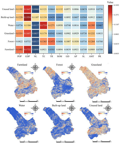 The contributions of the driving factors and the growth probabilities of all LULC types.