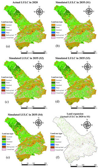 LULC maps for 2035 under different scenarios. (a) Actual LULC in 2020. (b) Simulation result of S1. (c) Simulation result of S2. (d) Simulation result of S3. (e) Simulation result of S4. (f) Land expansion of actual LULC in 2020 to S1.
