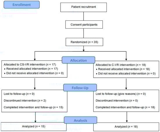 Thirty-five children with IDD were randomly assigned to the following two groups: the cognitive function and social skills-based virtual reality exercise system (CS-VR) or the conventional virtual reality exercise system (C-VR). Randomization was stratified by age, sex, and diagnosis. Two subjects in the CS-VR group were excluded due to three or more absences from the CS-VR intervention. Finally, of the 33 subjects, 15 in the CS-VR group (12 boys and 3 girls) and 18 in the C-VR group (14 boys and 4 girls) completed each intervention program (Figure 1). For 2 days, the participants underwent evaluations of cognitive functions and social skills, as well as the Test of Gross Motor Development-2 (TGMD-2) to test exercise performance. On the first day of the visit to the laboratory, anthropometric parameters of the participants were measured, while they were given explanations of the overall experimental protocol and risk factors. All participants underwent two sessions to familiarize themselves with the VR exercise program. The CS-VR group underwent a VR exercise program based on cognitive function and social skills scores. The IoT-based CS-VR was interconnected with a tablet-based application that collects cognitive functions and social skills data. The participants were tested before and after an 8-week CS-VR or C-VR intervention. Both the groups underwent a VR exercise program comprising whole-body exercises once a week.