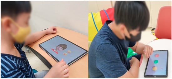 A tablet-based app was used to assess the social skills of children with developmental disabilities (Figure 3) []. The assessment consisted of eight items as follows: imitation, joint attention, pre-symbolic knowledge, symbolic behaviors, understanding rules, emotion perception, and perspective-taking. The maximum score of each sub-item was 10 for a total score of 80. The time taken for the assessment was approximately 20 min, with variations according to the level of social skills across the participants. The details of the sub-items are listed in Table 6. A ROC analysis was performed to determine the cutoff score for the upper and lower ranges of social skills. For a total score of ≥64.5, the participants were classified into a higher-level CS-VR exercise program. For a total score of <64.5, the participants were classified into the lower-level CS-VR exercise program.