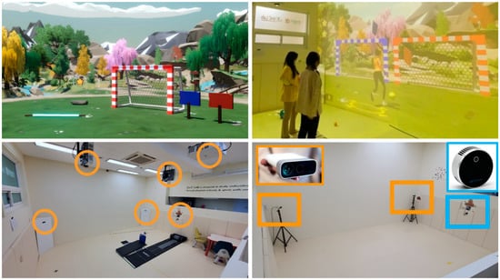 A VR exercise program was conducted in a classroom-sized environment of 5 m × 5 m × 4 m, with a screen spanning 5 m × 4 m. In addition, to construct visual and audio simulations within the space, virtual reality projectors, Kinect, Lidar, speakers, personal computers, and monitors were employed (Figure 4). The IoT-based CS-VR group was provided with tablet-based app information that interconnected cognitive functions and social skills data of the individual levels, but not the VR group.
