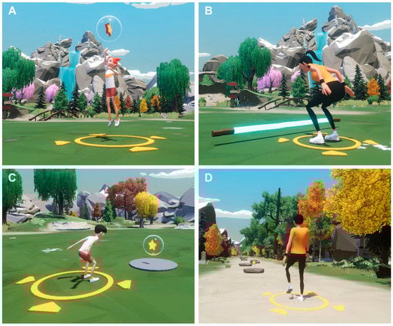 The VR exercise program consisted of one psychiatrist, two exercise physiologists, one expert in adapted physical education, and four graduate teaching assistants majoring in sports psychology. Once per week, 60 min sessions of intervention with VR exercise were scheduled as follows: 10 min for dynamic stretching, 40 min for exercise, and 10 min for feedback and cooling down (Table 7). The VR exercise program consisted of a horizontal jump, running, high jump, walking exercise, bar hurdle, step exercise, ball-kick, ball throw, balance exercise, and animal-like motion (Figure 5).