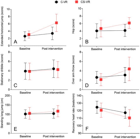 (A) Comparison of the mean of extended horizontal jump score between CS-VR and C-VR, F(1, 31) = 12.452, p < 0.01, (B). Comparison of the mean of hop score between CS-VR and C-VR, F(1, 31) = 6.705, p < 0.05, (C). Comparison of the mean of stationary dribble score between CS-VR and C-VR, F(1, 31) = 0.084, p = 0.773, (D). Comparison of the mean of over arm throw score between CS-VR and C-VR, F(1, 31) = 7.654, p < 0.01, (E). Comparison of the mean of standing long jump between CS-VR and C-VR, F(1, 31) = 11.01, p < 0.001, (F). Comparison of the mean of RHR between CS-VR and C-VR, F(1, 31) = 5.432, p < 0.001. Error bars indicate standard deviation (SD).