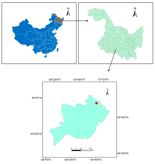 We conducted the field experiment in 2018 at the National Modern Agricultural Demonstration Park’s experimental station in Minzhu Town, Harbin City, China (45°49′ N, 126°48′ E.) on chernozem soil (Mollisols in USA-ST) (Figure 1). The site has an elevation of 117 m above mean sea level. The climate is cold temperate continental monsoon, with a mean annual temperature of 4.5 °C, and has mean winter and summer air temperatures of −18 °C, and 24 °C, respectively, as well as an effective accumulated temperature (≥10 °C) of 2968 °C. It has an annual sunshine time of 2668 h, a frostless period of 131–146 days, and a mean annual precipitation of 585 mm in the last 20 years, characterized by one main rainfall period in summer (July–September). This region is dominated by a typical single-cropping rice system. The soil type is Phaeozem, and the basic properties of soil were as follows: pH (1:5 soil:water) 7.4, total N 3.45 g kg−1, total P 0.89 g kg−1, total K 31.69 g kg−1, available N 79.77 mg kg−1, available P 56.81 mg kg−1, available K 167.41 mg kg−1, and soil organic matter 29.69 g kg−1.