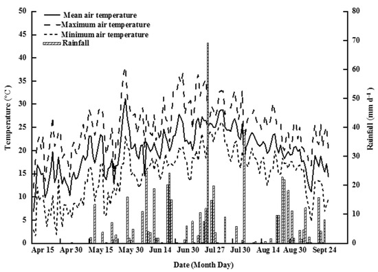 Figure 2 depicts the climatic data for the rice-growing season. Throughout the rice-growing season, the mean temperature was 20.1 °C, with the mean maximum threshold recorded in July. On 16 April and 18 June, the maximum and minimum air temperatures were recorded at 1.6 °C and 38.0 °C, respectively. The total rainfall and sunshine times were 543.2 mm and 1581 h, respectively.