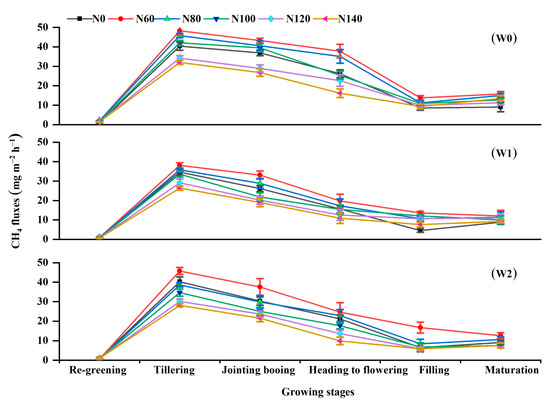 The dynamics of the measured CH4 fluxes are presented in Figure 3. They were characterized by a unimodal curve, which showed that the CH4 emissions steadily ascended with time, peaked at the tillering stage, gradually decreased by the jointing–booting stage, and then remained at low levels until the end of the rice season. Moreover, the CH4 emissions peaks reached as high as 40.47 mg m−2 h–1, 32.95 mg m–2 h–1, and 36.25 mg m–2 h–1 on average for the W0, W1, and W2 treatments, respectively. The average CH4 flux was highest for W0 (13.44 mg m−2 h−1), followed by W1 (10.06 mg m−2 h−1), and then W2 (10.87 mg m−2 h−1), except for the re-greening and maturation stages at the same N fertilization level. In all the water regimes, CH4 emissions were stimulated by low N promotion and prevented by high N fertilization (Figure 3).
