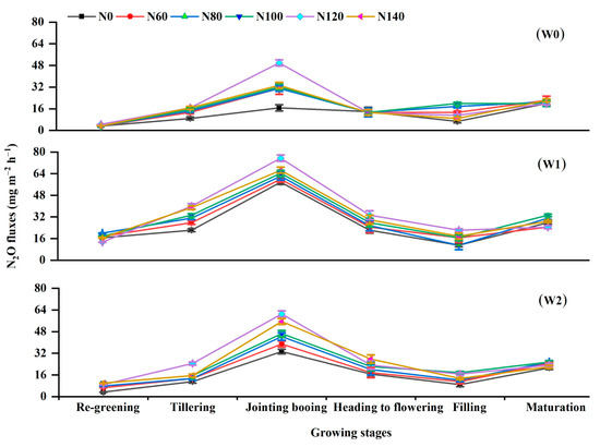 Variations in N2O fluxes, as affected by irrigation regimes with different N application rates during the rice-growing period. W0, W1, and W2 represent continuous flooding, intermittent irrigation, and control irrigation (W2), respectively. Urea application at rates of 0 (N0), 60 (N60), 80 (N80), 100 (N100), 120 (N120), and 140 (N140) kg N ha−1.