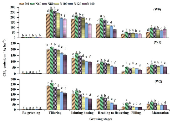 Seasonal CH4 emissions affected by irrigation regimes with different N application rates during the rice-growing period. W0, W1, and W2 represents continuous flooding, intermittent irrigation, and control irrigation (W2), respectively. Urea application at rates of 0 (N0), 60 (N60), 80 (N80), 100 (N100), 120 (N120), and 140 (N140) kg N ha−1. Values followed by the different letter are significant different at p < 0.05.