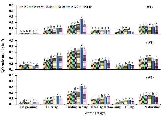 Seasonal N2O emissions affected by irrigation regimes with different N application rates during the rice-growing period. W0, W1, and W2 represent continuous flooding, intermittent irrigation, and control irrigation (W2), respectively. Urea application at rates of 0 (N0), 60 (N60), 80 (N80), 100 (N100), 120 (N120), and 140 (N140) kg N ha−1. Values followed by the different letter are significant different at p < 0.05.