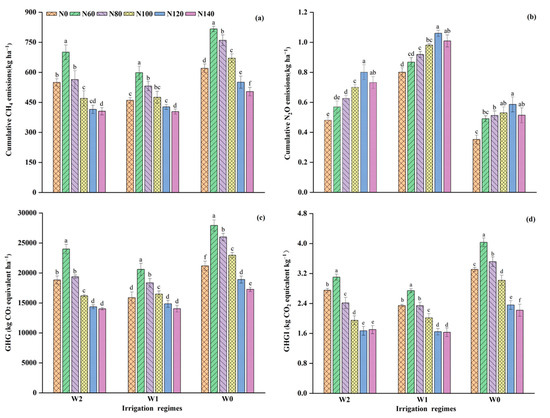 Cumulative emissions of (a) CH4, (b) N2O, (c) total global warming potential (GWP), and (d) greenhouse gas intensity (GHGI) affected by irrigation regimes with different N application rates. Different lowercase letters above the standard error bars indicate significant differences among treatments during the rice-growing season (p < 0.05). Values followed by the different letter are significant different at p < 0.05.