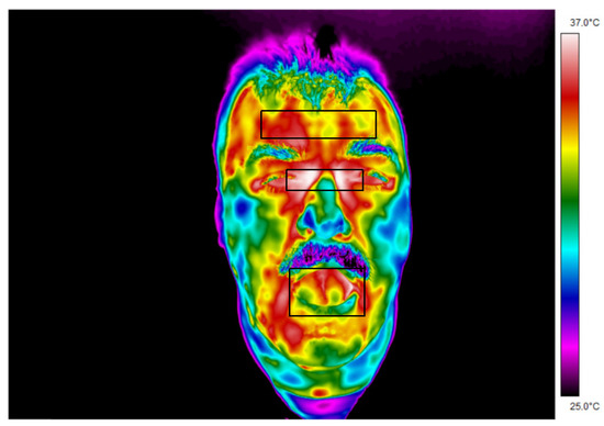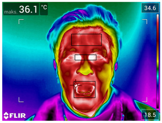The temperature parameters (maximum and average temperature) were derived from regions of interest marked on the thermal images (forehead, inside the corners of the eyes, mouth and ear). Exemplary thermal images with marked regions of interest are presented in Figure 1 and Figure 2.