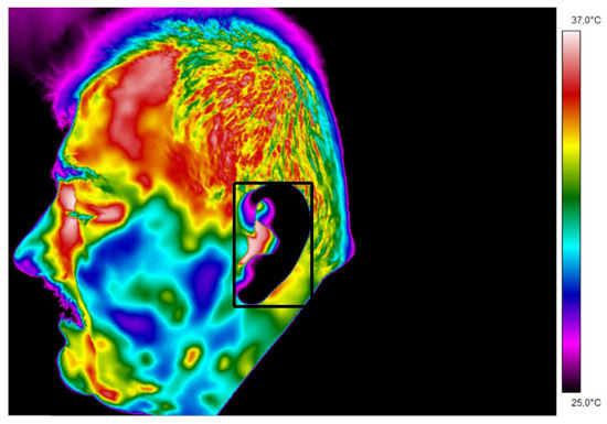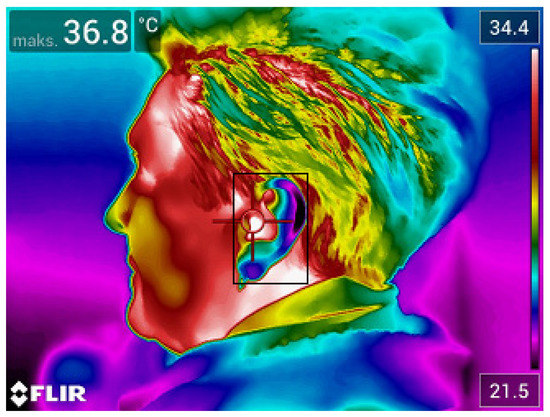 Thermogram 2 shows the temperature map of a face aligned with respect to the lens of the thermal camera in the AP projection. The area of interest containing the external auditory canal from which the maximum temperature was read was marked on the thermogram.