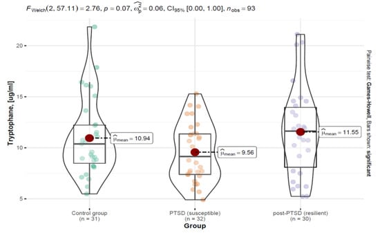 Welch’s ANOVA analysis of the mean measures showed no statistically significant main effect F (2; 57.11) = 2.76, p = 0.070, i.e., no significant differences in the tryptophan concentration levels between the groups. The effect size was found to be moderate, = 0.06, indicating that the effect could have been significant if the sample size had been increased. The results of the analysis are shown in Figure 2 and Table 2.