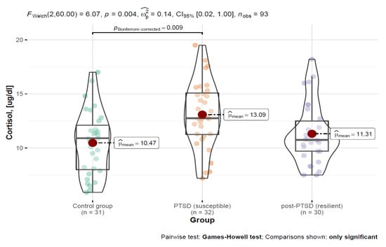 The Games-Howell post hoc test with a Bonferroni adjustment indicated significant differences between the following groups: control group (M = 10.47; SD = 2.97)—PTSD-SS group (M = 13.09; SD = 3.07).