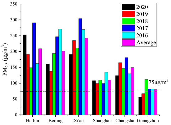Figure 2 shows that the outdoor concentration values for each year, corresponding to no-guarantee for 5 days, were quite different. The PM2.5 concentration values would rebound to a certain extent; the pollution was heavier or lower than the previous year. Only the outdoor PM2.5 concentration values for Guangzhou in 2020 and 2019 were lower than the standard (75 μg/m3) [28], at 56 μg/m3 and 67 μg/m3, respectively. The differences between the maximum value and the minimum value in 5 years for Harbin, Beijing, Xi’an, Changsha, Guangzhou, and Shanghai were 142 μg/m3, 133 μg/m3, 113 μg/m3, 57 μg/m3, 56 μg/m3 and 36 μg/m3, respectively. The largest difference between the outdoor concentration in each year and the 5-year average concentration was found for Harbin, with 81.8 μg/m3. The smallest difference was found for Guangzhou, with 2.2 μg/m3. Therefore, it could be seen that the outdoor PM2.5 design concentration, calculated using the method of no-guarantee days, still had certain fluctuations. The method of calculating no-guarantee days using the average data for many years was more reasonable. Related research also gave the same results [6,15], which again verified the correctness of this paper. However, a large amount of data are needed for analysis if the method of no-guarantee days uses the data for many years. In addition, the statistical analysis process is relatively cumbersome, requiring extensive time to complete, and errors occur in the data processing.