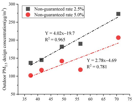 Finally, the cumulative relative frequency is shown as the horizontal axis, while the upper limit of PM2.5 concentration group is shown as the vertical axis [22]. The cumulative relative frequency is the guarantee rate. The PM2.5 concentration corresponding to the guarantee rate is the outdoor PM2.5 design concentration value.