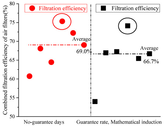 Figure 6 shows that the filtration efficiency of air filters ranged from 60.7% to 75.3% using the method of no-guarantee days, and the average efficiency was 69.0%. The filtration efficiency of air filters ranged from 54.0% to 74.1% using the methods of guarantee rate and mathematical induction, and the average efficiency was 66.7%. The results obtained using the method of no-guarantee days were higher than those obtained using the methods of guarantee rate and mathematical induction. The relevant parameters of existing air filters of different grades, according to previous market research and related test research, are given in Table 6 [16,30,31].