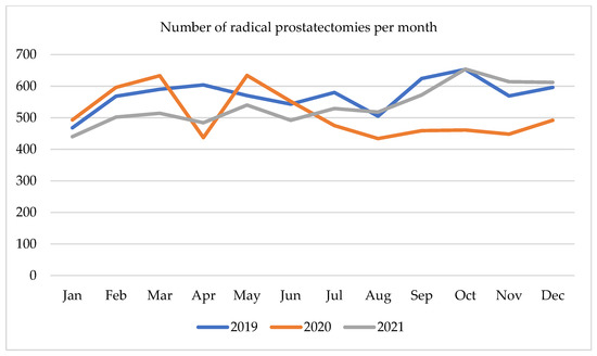 Number of radical prostatectomies per month in 2019–2021.