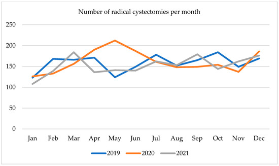 Number of radical cystectomies per month in 2019–2021.
