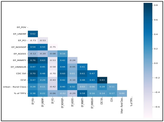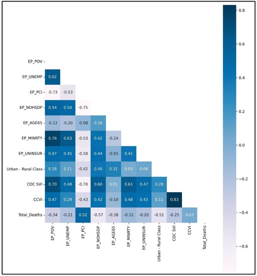 Various SDOH factors contribute directly or indirectly to the health disparities in the US. The CDC/ATSDR SVI uses US Census data to determine the social vulnerability of every census tract. The CDC/ATSDR SVI ranks each tract on 15 social factors, including poverty, lack of vehicle access, and crowded housing, and groups them into four related themes. Each track receives a separate ranking for the four themes and an overall order [21]. Amongst them, the county-level SDOH factors or county-level social and environmental variables used in this study are the percentage of persons below the poverty estimate, unemployment rate estimate, per capita income estimate, 2014–2018 ACS, percentage of persons with no high school diploma (age 25+) estimate, percentage of persons aged 65 and older estimate, 2014–2018 ACS and percentage minority (all persons except white, non-Hispanic) estimate, 2014–2018 ACS, urban-rural classification scheme for counties, social vulnerability index (SVI) scores and COVID-19 community vulnerability index (CCVI) scores. Both SVI scores and CCVI scores vary from 0 to 1; lower scores represent lower vulnerability, and higher scores represent higher vulnerability.