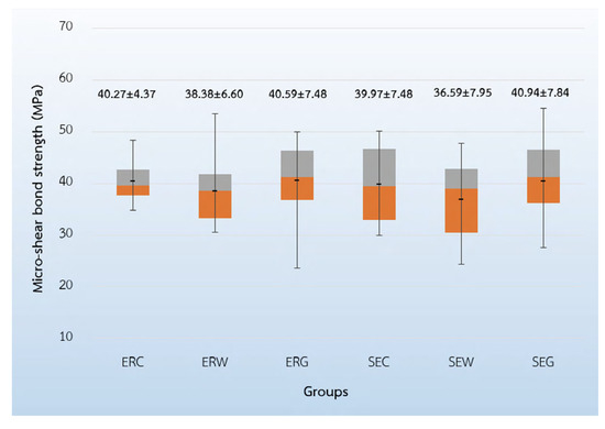 Micro-shear bond strength of the six specimens (MPa).