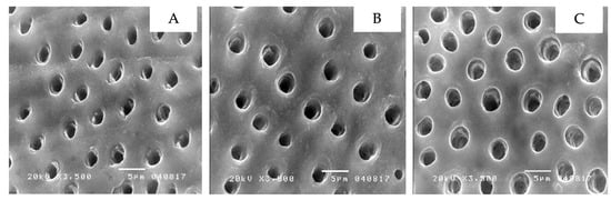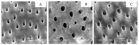 The dentin micro-morphology with self-etching primer applied to demonstrate a clean surface with widely open dentinal tubules: non-contaminated dentin (A), dentin contaminated with topical anesthetic solution (B), dentin contaminated with topical anesthetic gel (C).