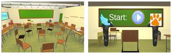 Images of the virtual environment. Left: Virtual classroom with the participant’s chair surrounded by a circle of chairs and basic classroom furniture. Right: View from the participant’s position in the virtual environment facing the blackboard and the virtual controller models.