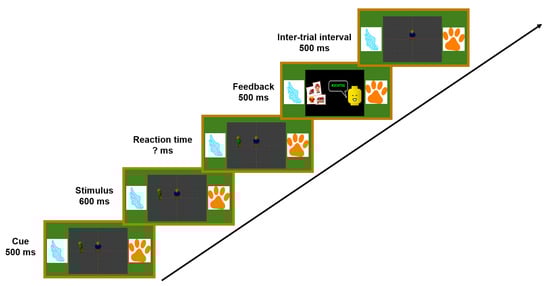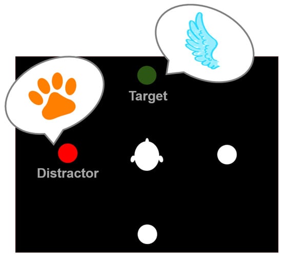 Exemplary trial indicating the target stimulus at the frontal and the distractor at the left position. The target stimulus belongs to the category of flying animals, while the distractor is a non-flying animal, yielding an incongruent trial.