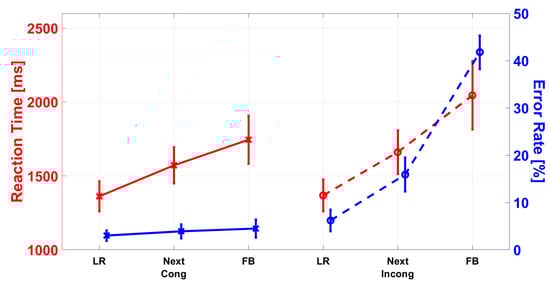 The ANOVA revealed a main effect of AT, , indicating lower RTs for repetition trials than for switch trials (1586 ms vs. 1665 ms). A main effect of C, , suggests lower RTs in congruent trials compared to congruent trials (1559 ms vs. 1692 ms). Mauchly’s test indicates that the assumption of sphericity was violated for TD-PC (). Therefore, the degrees of freedom were corrected using Greenhouse–Geisser estimates (). The main effect of TD-PC was significant, . Bonferroni-adjusted post hoc tests revealed significantly lower RTs for LR (1365 ms) vs. next-to (1616 ms) conditions (), as well as for FB (1895 ms) conditions (). The comparison of next-to and FB was also significant ().
