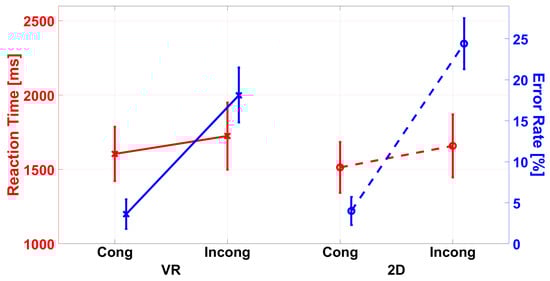 Difference in reaction times (RT, red in ms) and error rates (ER, blue in %) between the 2D and VR group for the congruency. In the reaction time and error rates, the ANOVA revealed a main effect of congruency, indicating lower RTs and ERs in congruent trials. For ERs, the ANOVA also revealed an interaction with the group indicating lower ERs for the VR than the 2D group in incongruent trials. The error bars represent the standard error.