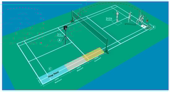 The laboratory design is as shown in Figure 1. The badminton serve position (A) is located at the intersection of the center line and the serve line, and the badminton is sent to the designated area B (50 cm × 50 cm) in the same state through the badminton serve machine.