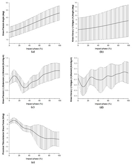 Mean (±SD) knee biomechanical patterns during the impact phase of the badminton landing task. The flexion angle (a) and valgus angle (b), extension moment (c) and valgus moment (d), and anterior proximal tibia shear force (e) are shown.