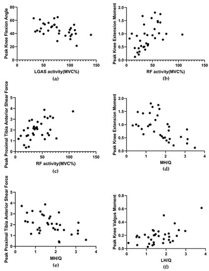 Relationship between LGAS activity and peak knee flexion angle (a). Relationship between RF activity and peak extension moment (b) and peak proximal tibial anterior shear force (c). Relationship between MH/Q and peak extension moment (d) and peak proximal tibial anterior shear force (e). Relationship between LH/Q and peak valgus moment (f).