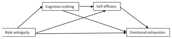 Role ambiguity is negatively and indirectly related to burnout, mediated by cognitive crafting and self-efficacy.