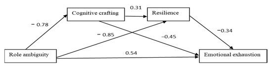 Going further with the testing of the mediation models, as depicted in Table 3, we first computed the model for cognitive crafting as the first mediator (M1) and for resilience as the second mediator (M2) in the mediation chain. According to our results, role ambiguity was significantly related to cognitive crafting (b = −0.78, p < 0.001), and a high level of cognitive crafting predicted a high level of resilience (b = 0.31, p < 0.001). Next, we computed the analyses for resilience (M2) as the second mediator, and, as was stated, resilience was strongly and negatively related to emotional exhaustion (b = −0.34, p < 0.000). When we controlled the effect of mediators, role ambiguity was positively and significantly related to emotional exhaustion (b = 0.54, p < 0.03) and this direct effect was smaller than the total effect (b = 1.28, p < 0.001).