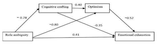 In line with Hypothesis 7, role ambiguity was indirectly related to burnout, totally mediated by cognitive crafting and optimism. As depicted in Table 4, the sequential indirect effect of role ambiguity on emotional exhaustion, via both mediators in the series (cognitive crafting and optimism), was positive, significant, and smaller than the total effect (b = 0.16, 95% CI [0.078, 0.294]). In addition, an indirect effect of role ambiguity on emotional exhaustion only through cognitive crafting (b = 0.87, 95% CI [0.572, 1.248]), and then, only through optimism (b = 0.42, 95% CI [0.217, 0.704]), was noticed. More importantly, the direct effect of role ambiguity on burnout was statistically insignificant (b = 0.41, 95% CI [−0.070, 0.896]). This result confirmed that there was total mediation support for the proposed theoretical model, which meant that cognitive crafting and optimism reinforced each other and completely buffered the negative impact of role ambiguity on emotional exhaustion.