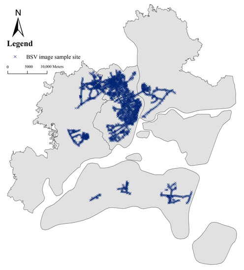 Previous studies mainly used questionnaire-based or GIS-based approaches to measure streetscape features at the macroscopic scale, which did not fully and objectively reflect the urban environment at the street scale and from the eye-level perspective [33]. However, with advances in computer vision, it is possible to measure street-scale features objectively by street view images. Google Street View (GSV) images, introduced in 2007, are images taken by a car along a street to simulate a pedestrian’s perspective. Many studies have indicated the feasibility of using street View Images to study street-scale environmental features [15]. Rundle et al. [34] compared seven environmental variables extracted through field surveys and Google GSV for 37 New York City neighborhoods. The results showed a high degree of consistency in 54.3% of the items. Zhang et al. [35] used street view images and deep learning to investigate the relationship between street visual elements and people’s perceptions. However, GSV cannot be obtained in China because of strategic and business policies. We thus used Baidu Street View (BSV), a GSV-like product developed by the Chinese company Baidu [36].