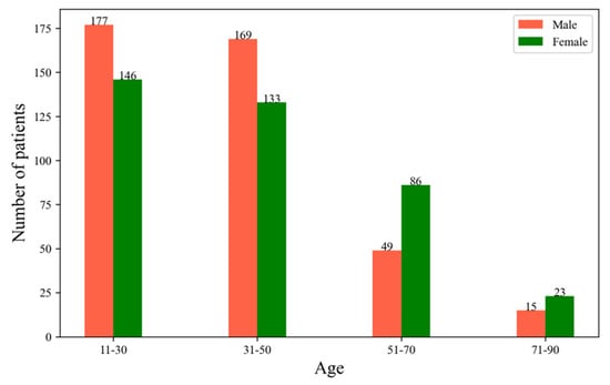 Mental health data Resident’s mental health was assessed using hospitalization data of patients suffering from psychiatric disorders in general hospitals from 2014 to 2015 in Zhanjiang City, Guangdong Province, with a total of 813 patients. The disease data were provided by Guangdong Medical University and included each patient’s admission time, place of residence, and primary diagnosis. According to the International Classification of Diseases, 10th Revision [46], the primary diagnosis mainly included psychiatric disorders such as organic mental disorder, recurrent depressive disorder, partially undifferentiated schizophrenia, obsessive-compulsive schizophrenia, schizoaffective disorder, acute schizophrenia-like psychotic disorder, epileptic psychosis, mental retardation, and psychotic disorder. We found that 15 patients under were 5 years old. We removed these cases as we thought the effects of urban streetscape could be ignored. Finally, there were only 798 patients left, with 410 males and 388 females. There are 323 patients aged 11 to 30, 302 patients aged 31 to 50, 135 patients ranging from 51 years old to 70, and 38 patients aged between 70 and 90. Figure 3 shows the number of patients by age and sex. It was found that 119 patients live in Chikan District, 267 patients live in Xiashan District, 151 patients live in Potou District, and 280 patients live in Mazhang District.