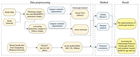 The framework for analyzing the spatial distribution of two streetscape features and their association with mental health. Note: the blue represents input data; the green represents methods; the orange represents the outputs.