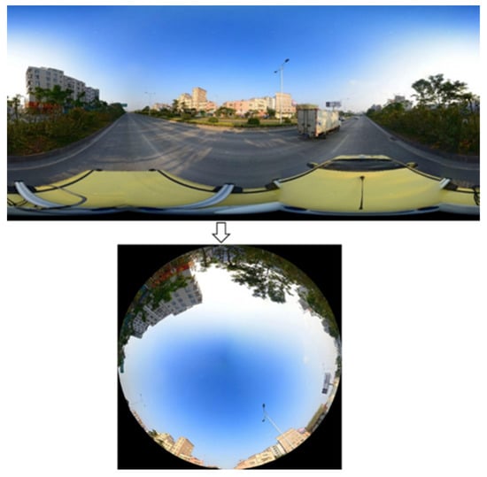 The street enclosure: The street enclosure is defined as the ratio of non-sky pixels in an image. According to Li et al., it can be calculated by using 1 minus Sky View Factor (SVF) [31,47]. As a dimensionless parameter of urban geometry, the Sky View Factor (SVF) indicates the degree of obstruction of the sky by buildings and trees. The SVF is zero when the sky is completely obstructed and 1 when the SVF is free of obstructions [31]. To extract SVF, panorama images were required to convert to fisheye images first. In this study, the panoramic image was converted into a fisheye image by PTgui (a software for processing images), and the process is shown in Figure 5. In this paper, we would use the enclosure of the street caused by both buildings and trees.