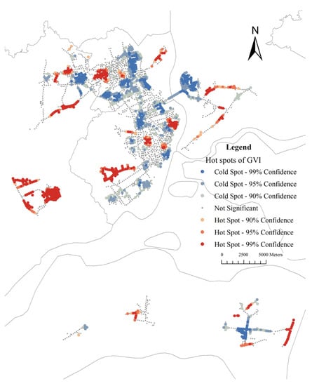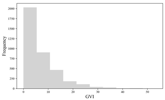 The average GVI for the sample sites in the study area is 7.03% (median: 4.79%, range: 0–53.54%). Figure 6 shows the histogram of GVI, suggesting that most sample sites have GVIs lower than 20%. Figure 7 reveals that there were a few high-value points of GVI, which are sporadically distributed in the study area, and most of the areas have a low GVI value. Global Moran’s I is 0.36 (z-score: 77.02, p-value: 0.00). The results demonstrate GVI values tend to cluster. As shown in Figure 8, the cold spot is widely distributed while the hot spot areas of GVI are patchily distributed. To be specific, there is one hot spot in the southwest Mazhang District, an obvious one in the central Chikan District, and a big one in the southern Xiashan District.