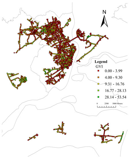 Green View Index (GVI): Yang et al. proposed an improved “Green View” index to evaluate the visibility of urban greenness. They defined GVI as the ratio of the number of pixels with vegetation per image [17]. This method has been used in many studies to calculate street greenness in many studies [15,17].