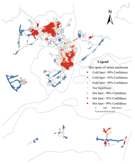 The average value of street enclosure for sample sites is 54.77% (median: 54.72%, range: 22–94%). Figure 9 shows most values of enclosure of the street range from 40% to 70%. Figure 10 shows that the values of the street enclosure are relatively high in the urban center area, and low values are distributed in the periphery of the city. Global Moran’s I is 0.48 (z-score: 94.84, p-value: 0.00). The results indicate a statistically significant cluster of the street enclosure. Figure 11 indicates that the street enclosure had a different spatial pattern from the GVIs. The hot spot areas are mainly distributed in two major areas. One covers the whole area of Chikan District and northeast of Mazhang District, and the other locates in the east of Xiashan District and southwest of Potou District.