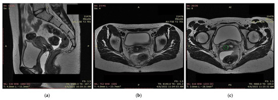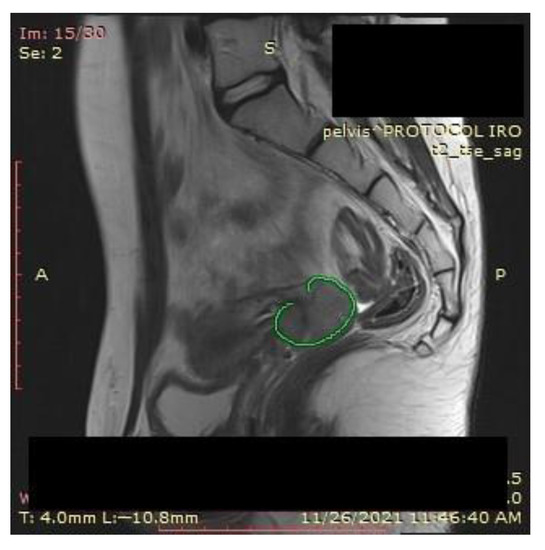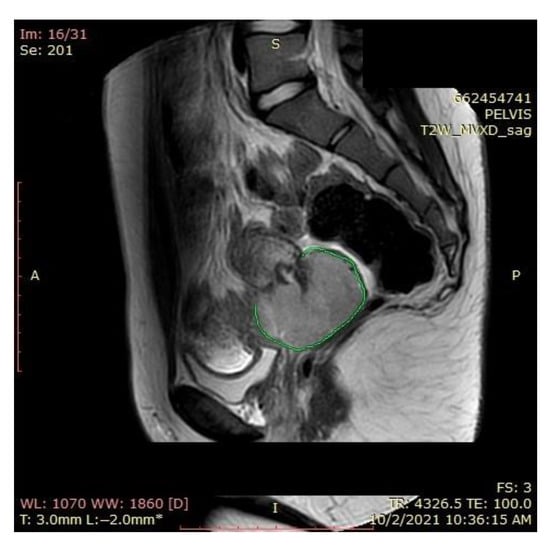 An MRI scan performed immediately the next day after finishing the radiotherapy and chemotherapy sessions showed a significant favorable response, with the persistence of a necrotic and ulcerative cervical area and a possible residual lesion on the right side of the cervix (Figure 12).