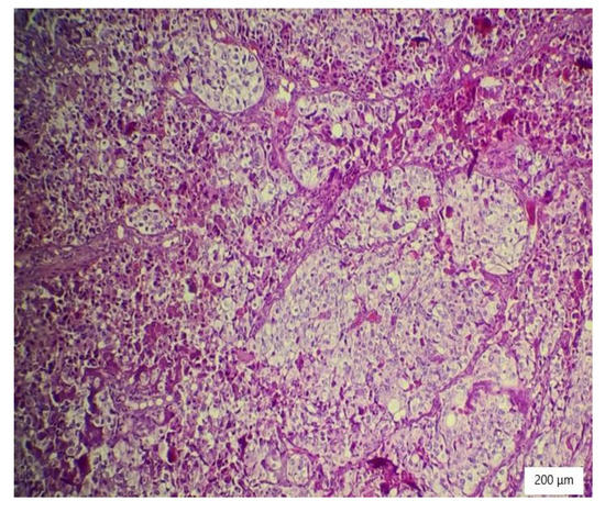 Solid architecture of the tumor with highly atypical cells with hyperchromatic nuclei and necrosis (HE ×100).