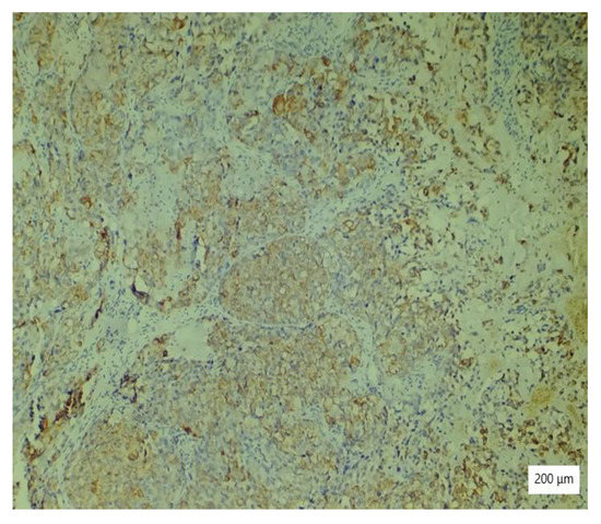 The microscopic analysis of the cervical mass biopsy showed the presence of the following morphological aspects: mixed architecture with solid and tubulocystic patterned areas; mainly composed of nests of cells with clear or eosinophilic cytoplasm (intracytoplasmic glycogen); and prominent hyperchromatic nuclei, some with round nucleoli and high mitotic activity (16/10 HPF) (Figure 2, Figure 3 and Figure 4). Additionally, we noted abundant inflammatory infiltrate that was mainly made up of the lymphocytes and plasmacytes present in the hyalinized stroma, and this was determined to be associated with the area of necrosis. Periodic acid–Schiff staining was strongly positive in the cytoplasm, consistent with glycogen (Figure 5). Immunohistochemical staining showed a diffuse positive reaction for CK AE1/AE3, PAX8, and AMACR; rare cells showed CEA-positive expression; and there was a negative reaction for p63, CD30, OCT4, ER, SALL4, synaptophysin, CD56, and p16, which were focally positive in tumor cells (Figure 6, Figure 7, Figure 8, Figure 9, Figure 10 and Figure 11). The histological diagnosis was HPV-negative clear cell adenocarcinoma of the uterine cervix.