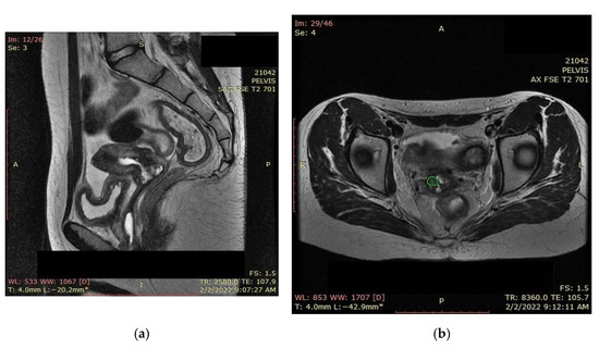 (a) MRI and (b) CT—significant favorable post-radiotherapy and chemotherapy response, with the persistence of a necrotic and ulcerative cervical area and a possible residual lesion on the right side of the cervix (the green highlighted area).